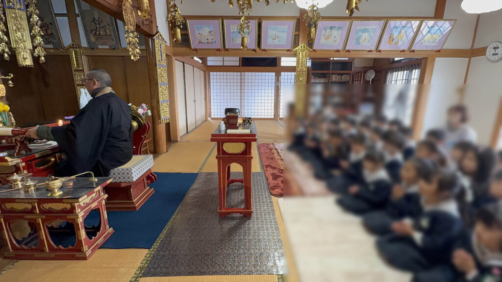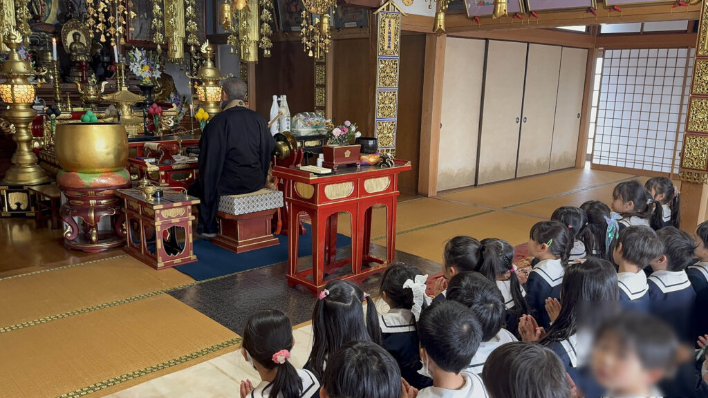 「命の集い」について説明をし、学んだあとに正座をして本堂に祈願をしました。園児たちはすごく集中力があり、祈願に対して好奇心旺盛で驚きました。